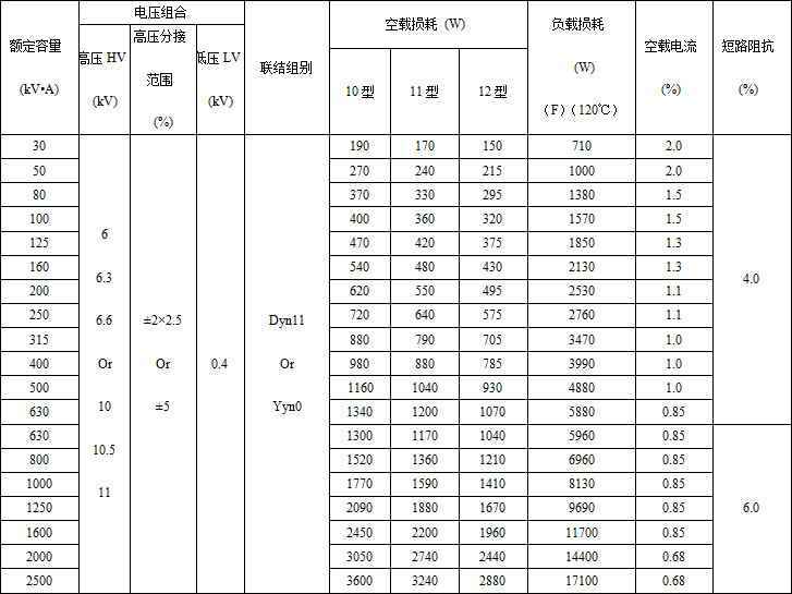 10kV级SC(B)型干式变压器技术参数